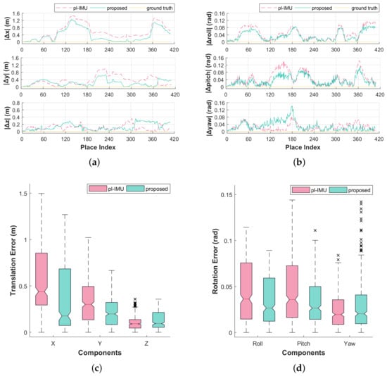 Graphs and box-plots for local pose error compared to the ground truth for each compensation method (pl-IMU and our proposed method). (a) local errors of translational components; (b) local errors of rotational components; (c) box-plot of translation error; (d) box-plot of rotation error.