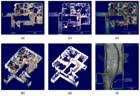 Trajectories and mapping results with truncated ceiling. (a) optimized map top view; (b) optimized map bird’s-eye view; (c) ground truth map top view; (d) ground truth map bird’s-eye view; (e) superimposed map top view; (f) superimposed map close-up view. (a,b) display RGB-D map optimized by the proposed method using low-cost sensor system. (c,d) show ground truth acquired using high-cost sensor system. (e,f) show superimposed map between the optimized map and the ground truth, where green-colored point cloud and trajectory are the ground truth. To improve depth visualization, an eye-dome lighting shader is applied to (e,f) where the point cloud of ground truth is randomly subsampled by 10%.