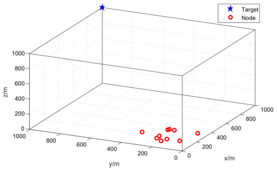 In the simulations, we assume that M acoustic nodes are placed on the unmanned aerial vehicles (UAVs). The UAVs are networked together to localize an aeroplane or a helicopter. The UAVs are flying at the same speed and in the same direction. The positions of UAVs are generated randomly within a 500 m × 500 m × 50 m cube. The target location is set at (1000 m, 1000 m, 1000 m). Figure 2 plots the sensor-target geometry, where the red circle denotes the position of the node and the blue star represents the location of the target.