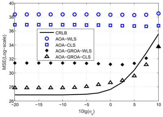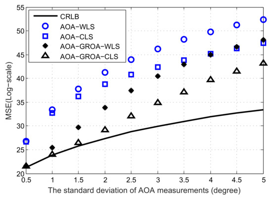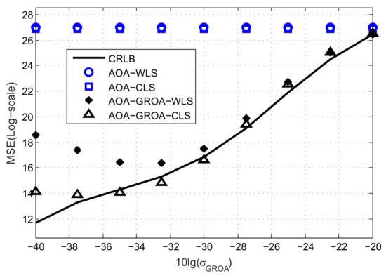 Figure 5 depicts the average MSE performance of the methods as varies, where and are fixed at 10−2 radian and 3 × 10−3, respectively. Figure 5 validates the proposed AOA-GROA CLS method, which provides superior performance on the sensor position uncertainty. The AOA-GROA CLS method is very useful for a small value of . When reaches 10 m, the results of using the AOA-GROA WLS and AOA-GROA CLS methods are almost the same.