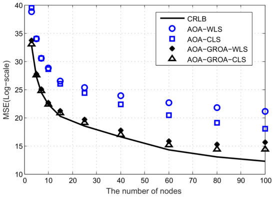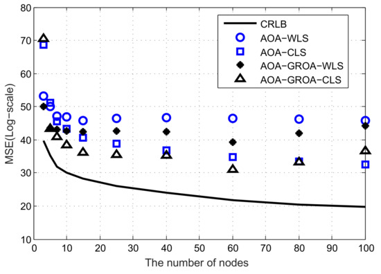 Average MSE results of AOA-only WLS, AOA-only CLS, AOA-GROA WLS and AOA-GROA CLS methods with respect to various number of nodes, = 0.05 radian, = 3 × 10−3 and = 10−2.