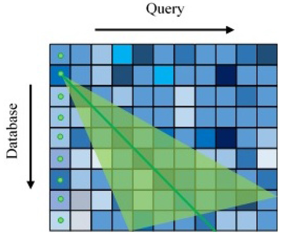 For each matrix entry, a sub-route score for a range of possible slopes (semi-transparent region). When all scores are calculated for one starting point, the minimal score of all of them is selected. Finally, the sub-route with the smallest score and the second smallest score are used to compute the best database matching to the input query sequence.
