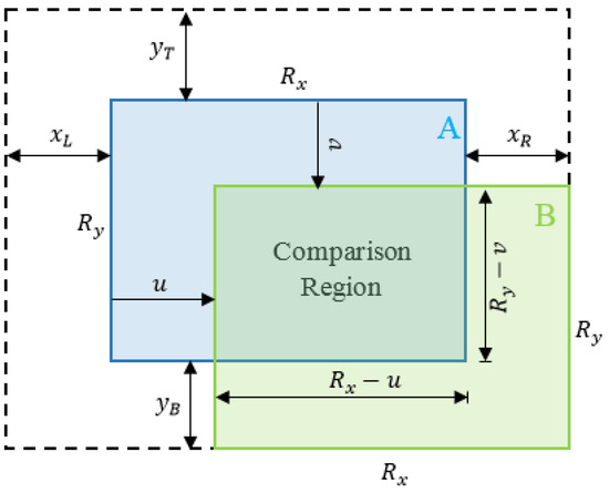 where u and v are the coordinates in the difference score, and are vectors representing the overlapping region of images A and B and and are the pixel coordinates in A and B respectively (Figure 2).