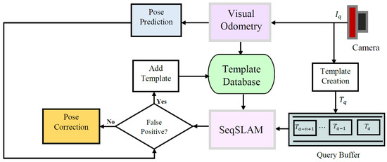 We propose a kind of hybrid approach that combines local metrical localization (e.g., visual odometry) with a topological one (e.g., SeqSLAM). The vehicle tracking is performed by VO leading to drift due to the run-time error accumulation. Loop closure recognition via SeqSLAM allows incremental pose drift [29] to be overcome and the state and position of the vehicle to be recovered in cases where the tracking is lost. The use of a two algorithms fusion-based approach is mainly motivated by the fact that VO is prone to drift and place recognition approaches generally suffer from false positive (FP) detections. Although false positives have an impact on the short-term deviation of the system inside the filtering framework, this latter robustly recovers after some time. Combined methods give, therefore, an increased robustness to the system. The template library can be loaded beforehand (when a learning has already been done) or created in real-time (without prior learning). In such a case, the template database is populated with the acquired frames from the monocular stream converted into visual templates along with their poses acquired from the VO module. The query sequence is a FIFO buffer holding the n last templates. In fact, when a new frame is captured, features are detected and matched with the last acquired frame and the relative motion is estimated using the VO module, which will subsequently allow the pose of the vehicle to be predicted. The frame is also converted into a visual template and added to the query sequence with the aim of matching with a database template. The SeqSLAM module performs the matching that will be tested to determine whether it is a true positive based on both a matching score provided by SeqSLAM and the prediction made by the VO module. If a place is recognized, a correction of the pose is made. Otherwise, the template is assumed to belong to a new place and is, therefore, added to the database as depicted in Figure 3.