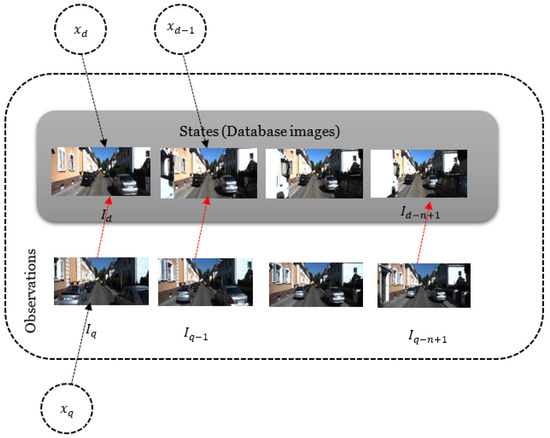 In the SeqSLAM algorithm, the input is the query sequence that refers to the last acquired images converted to visual templates. The algorithm selects the path in the difference matrix that connects the query templates to the database ones. The observations are the sequence of n query images , and the state space S is the set of database images . For each observation there is a state corresponding to one of the database images in the state space as depicted in Figure 4 where primitive high-resolution images are used instead of low-resolution templates for the purpose of clarity. Thus, the observables here are the query and database templates, which are continuously calculated from the monocular sequence and the tracked state is hidden. However, to each database template is connected a pose where this image has been taken and to the query template to be matched is connected the predicted state. Hence, the unobservable state variables are directly obtained from the observable templates and the transformation from the state space to the observation space is a simple linear model.