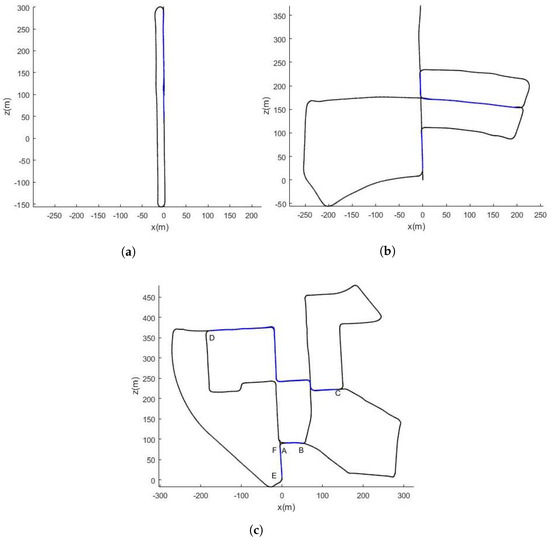 Ground truth trajectories of sequences 00, 05 and 06 of the KITTI dataset comprising loop-closures. (a) Sequence 06; (b) Sequence 05; (c) Sequence 00.