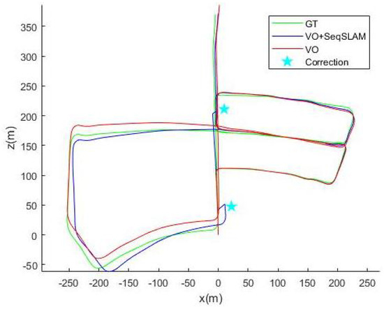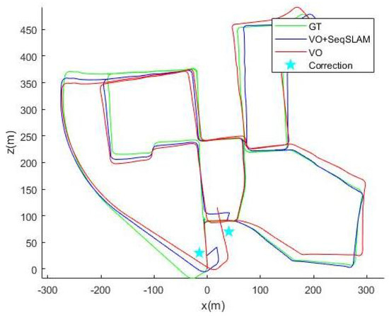 Other approaches are based on the fusion of two or multiple algorithms. In fact, data from different algorithms might be combined to derive a more accurate estimate of the vehicle’s pose, as their uncertainties might be complementary. Illustrated in [27] is the fusion of visual odometry, used to track the position of a camera-equipped Micro Aerial Vehicle (MAV) flying in urban streets with an air-ground image matching algorithm using a cadastral 3D city model by means of a Kalman filter. Additionally, our approach is based on the fusion of VO and the appearance-based place recognition algorithm SeqSLAM. We adapted SeqSLAM for use in the context of long-term navigation for loop closure detection in order to reduce the drift caused by VO. The database of images is, therefore, created online. However, in the case of learning a geo-referenced database beforehand, the method remains valid and more accurate estimates could be obtained in the global reference frame without assuming a loopy trajectory.