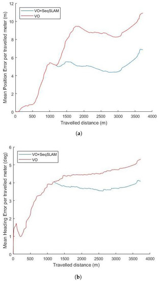Mean error per travelled meter with respect to the travelled distance for Seq00. (a) mean position error per travelled meter; (b) mean heading error per travelled meter.