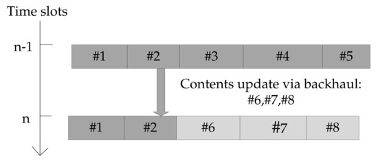 Illustration of content update between two successive time slots, represent the contents updated via the backhaul network.