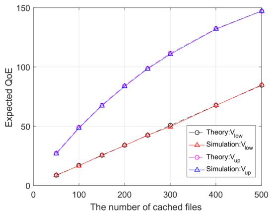 Figure 3 shows the upper and lower bounds of the expected QoE as functions of the number of cached files M. It can be observed that the lower bound increases almost linearly with increasing M, while the upper bound increases with diminishing returns when M gets large. Moreover, the numerical (i.e., theoretical) and empirical (i.e., simulation) curves are shown to agree well. This serves as a validation to our theoretical derivations.