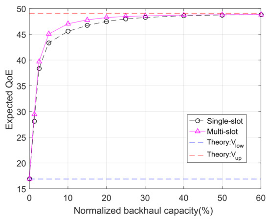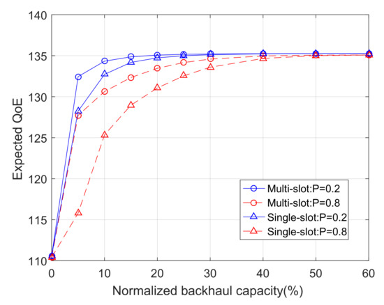 The expected QoE as a function of the normalized backhaul capacity in the multiple time slot optimization problem (S = 200 MB, I = 500).