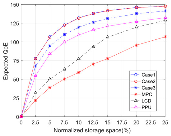 The expected QoE as a function of normalized storage space for different caching policies.