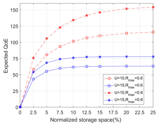 Figure 7 shows the expected QoE as a function of the normalized storage space with varying system parameters. First, Figure 7 illustrates the impact of the average number of users per BS on the QoE performance. It can be seen that, as the number of users U increases, the QoE performance degrades. This is because, when U increases, the downlink capacity allocated to each user reduces, which ultimately results in a reduction in the expected QoE. In addition, Figure 7 also shows how the QoE performance changes with different (), which represents the concentration of file popularity. It can be seen that, with increasing , the performance of the system also increases due to a higher concentration of user interest in a given number of cached files.
