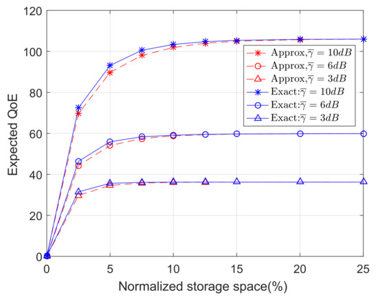 The expected QoE as a function of the normalized storage space with approximated and exact utility functions.