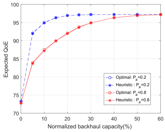 The expected QoE as a function of the normalized backhaul capacity in the single time slot optimization problem (S = 200 MB).