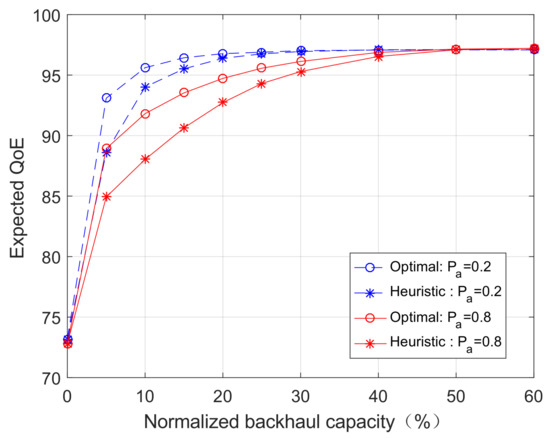 The expected QoE as a function of the normalized backhaul capacity (M = 100).