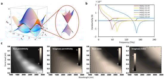 Optoelectronic property of graphene (a) Band structure; (b) Calculated conductivities varying in Fermi level; (c) Calculated permittivity and refractive index, in real and imaginary parts, respectively. Here (a,b) are reproduced from Refs. [36,42], respectively.