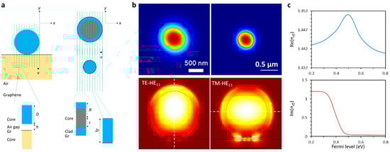 Calculation and simulation of graphene-based microfibers. (a) Scheme of the finite element method (FEM) simulation for graphene-based microfibers. (b) Simulated electric field intensity distributions. (c) Calculated effective index of a graphene-based microfiber, relying on the Fermi level of graphene. Here simulations in (b) are reproduced from Refs. [43,46].