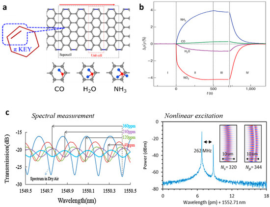Moreover, in 2017, based on graphene-enhanced Brillouin scattering, a microfiber interrogated Whispering Gallery Mode ptomechanical gas sensor was realized. Figure 11b shows the design and the sensing performance. It reported an unprecedented high sensitivity (1 ppb) for NH3 gas detection, which is a globally leading number comparable to other advanced techniques [95,96]. Such a remarkable breakthrough revealed the “electron–phonon–photon” interaction in the graphene-based optomechanical resonator, going beyond all the conventional graphene-based optical or solid-state sensors. Optomechanical resonance was generated via Brillouin phase matching and nonlinear gain: