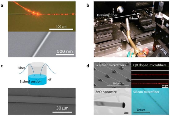 Sometimes one not only wants a microfiber-guiding evanescent field, but also hopes to keep the inner microstructures of the original fiber (such as photonic crystals and Bragg gratings); then, chemical etching becomes a choice [67,68]. For example, for silica-based fiber etching, hydrofluoric acid is commonly used as the corrosive agent. Compared to microfibers fabricated by fusing & drawing, the chemically etched microfibers have larger average diameters, usually in the range of 8–12 µm. Figure 4c shows this method and pictures of the chemically etched microfiber samples. In addition, for further specific purposes, microfibers are not only fabricated from glass materials, but also other materials such as polymers, silicon, and metal-oxides, by using diverse means such as thermal process, chemical growth, and self-assembly [62,63,64,65,66]. Figure 4d shows examples of these special microfibers.