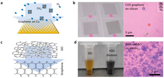Graphene fabrication. (a) Graphene grown by using chemical vapor deposition (CVD) method. (b) Pictures of graphene samples fabricated by using CVD method. (c) Graphene reduced from graphene oxide (GO) in liquid. (d) Picture of GO and reduced GO (rGO) dispersions, and the deposited reduced GO film on silicon substrate. Pictures in (b) are reproduced from Refs. [71,72].