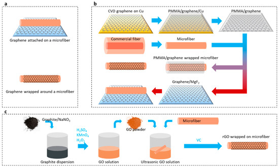 Graphene can be either attached on or wrapped around a microfiber, as schematically shown in Figure 6a. Figure 6b sketches the fabrication flows of a graphene-based fiber structure by using CVD technique [41]. For graphene attached on microfibers, graphene is transferred to a low refractive index substrate; afterwards, microfibers are put on the graphene, kept contacted. Such a van der Waals contact is firm and stable [41]. For graphene-wrapped microfibers, a substrate to carry graphene is unnecessary. The wet transfer of a CVD graphene film is done as follows: spin-coating a layer of polymethyl methacrylate (PMMA) on the surface of the graphene, forming the PMMA/graphene/Cu sandwich-like hybrid; dissolving the Cu under graphene by using FeCl3 solution; covering the PMMA/graphene flexible film on a substrate or wrapping it on a microfiber; removing the PMMA by using acetone, leaving only graphene remaining.