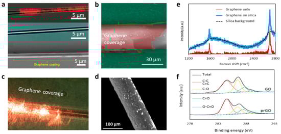 To characterize the quality of graphene on the microfibers, Raman spectroscopy [77,78,79], scanning electron microscopy (SEM), scattering measurement, and X-ray photoelectron spectroscopy (XPS) [80] are commonly applied. Figure 7a–d show the pictures of graphene-based microfibers, measured by optical microscopy and SEM. One can check the quality of the microfiber-graphene incorporation based on these images. Figure 7e plots a typical Raman spectrum of graphene on a fiber structure. Commonly, high-quality graphene on microfibers should have an ignorable D peak, and a G/2D ratio 0.3~0.5; the locations of the G peak and the 2D peak are influenced by the graphene doping. Commonly, CVD graphene is pure in chemistry, while graphene film reduced from GO may contain more functional groups, such as –OH and –COOH. These functional groups can be extremely useful for specific sensing applications; XPS is helpful to check them. Figure 7f plots the XPS of CVD graphene and reduced GO. For better deposition on microfibers, the reductions are usually controlled to make a C:O ratio > 4 [74].