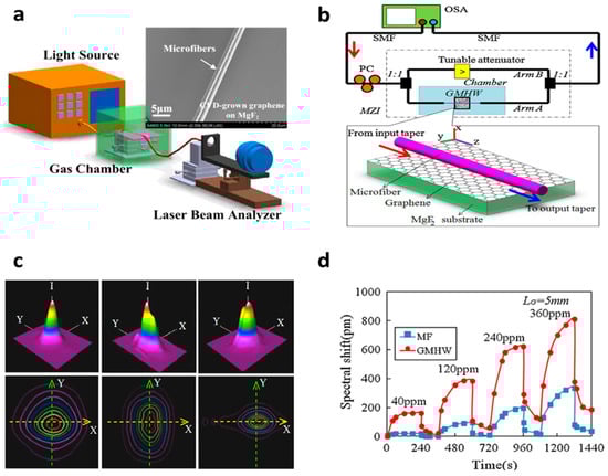 Based on the graphene-attached microfiber scheme, we reported gas sensors based on both optical intensity detection and interferometric demodulation by using mode field analysis or Mach-Zehnder Interferometer (MZI) [52,84]. Figure 8a,b show their implementations. A microfiber with a length of several centimeters and ≈1 µm diameter was used to couple light interacting with graphene. Such a scheme is similar to a graphene-based D-shaped fiber [85,86], but is easier to manipulate. In Ref. [84], we illustrated that the polarization-dependent transmission of the graphene-attached microfiber was sensitive to gas adsorptions, especially large molecules. As Figure 8c shows, the adsorption of acetone gas molecules would dramatically dampen the optical transmission; for example, for acetone gas with a concentration of 1150 ppm, the transmission loss increased over 3 dB, the maximum sensitivity of this structure was about 0.3 dB/ppk.