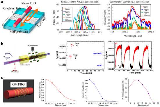 Graphene-based micro fiber Bragg grating (GMFBG) gas sensors (a) for NH3 gas detection, (b) for NO2 gas detection. (c) Diameter optimization of the micro FBG gas sensors. Figures in (a–c) are reproduced from Refs. [87,88,89].