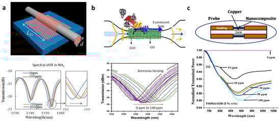 Another method to enhance light–graphene interaction in graphene-based microfiber structures is to excite high-order mode propagation with larger mode-field area or to excite plasmons. In 2014, Yao et al. demonstrated a graphene-based microfiber multimode interferometer, as shown in Figure 10a [46]. In this structure, the HE21 mode is more sensitive to local refractive index alteration than the in-core HE11 [90], hence its interference Free Spectrum Range (FSR) could be tuned by gas adsorption, resulting in a spectral resonance dip shift. In a sensing experiment, ~0.1 ppm for NH3 gas detection and ~0.2 ppm for H2O vapor detection were achieved. By using GO-ZnO film, Hu et al. also recently realized a NH3 gas sensor, demonstrating sub-ppm sensitivity, as shown in Figure 10b [91]. This GO-ZnO incorporated interferometric optical microfiber illustrated very high selectivity to NH3 gas. Additionally, in 2014, Mishra et al. also reported a graphene Surface Plasma Resonance (SPR) sensor based on microfibers for sensing NH3 gas [92]. Mishra et al. applied PMMA/graphene/Cu hybrid membrane directly to enhance the plasmons on Cu and the gas adsorption on the surface of the PMMA/graphene. It demonstrated both good sensitivity (ppm level) and relatively large dynamic range (hundreds of ppm).