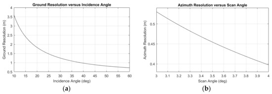 The resolution in ST mode. (a) The ground resolution versus the incidence angle; (b) The azimuth resolution versus the scan angle range.
