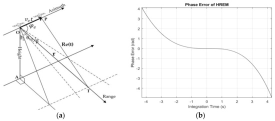 Initially, the traditional imaging algorithms were based on airborne SAR acquisition geometry that assumed that the target on the ground was still and the platform flew at a constant velocity. But in spaceborne cases, the platform’s flight path as well as the Earth’s surface are curved, and the Earth rotates continuously. In order to make the most of existing algorithms, the HREM, which used equivalent velocity and squint angle to describe the range history was proposed. This model (see Figure 2a) assumes that the sensor flies at a constant velocity , the sensor locates on point when the antenna points to the target T on the ground, and the azimuth time . The sensor locates on point P at an arbitrary azimuth time , A is the nadir point, the distance between and T is , the distance between P and T is , is the looking angle, is the squint angle, and is the complement angle of . Then, the range history can be expressed as: