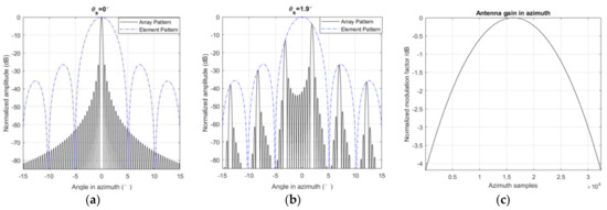 where is the power gain of the array antenna, is the power gain of a single element, is the number of elements in elevation, is the look direction or azimuth antenna pattern angle, and is the steering angle. The envelop of array gain is modulated by a function and Figure 3a,b shows relationship between the steering angle and the antenna pattern. The influence of the element pattern is more obvious in TOPSAR [26]. In this experiment, 32,130 frames of data in azimuth were acquired, and the normalized modulation factor of every frame can be found in Figure 3c.