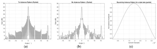 Finally, the antenna always illuminates the same scene on the ground in ST mode; therefore, the magnitude of images would be modulated by the antenna pattern. An intuitive phenomenon when the middle part of an image is brighter than the edges in azimuth Take the data acquired in this experiment as an example, we can get the antenna pattern in both transmit and receive mode with the help of auxiliary data, as shown in Figure 4a,b. According to the width of the imaged scene and distance of each pixel in azimuth, the beam width of the whole scene can be calculated. In this experiment, the beam width of the imaged scene is about 0.287° and the number of the azimuth samples in the final image is 38,588. In order to demodulate the antenna pattern, an interpolation operation is carried out on the round-trip antenna pattern, and the interpolated result can be found in Figure 4c. Then, the inverse of the curve shown in Figure 4c can demodulate the brightness of the focused image by every pixel at the image level.