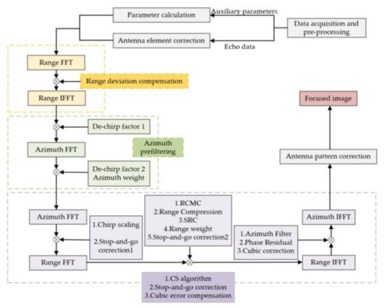 In this subsection, a processing flow of GF-3 in ST mode is proposed and it can be found in Figure 5. After data acquisition and preprocessing, the echo data and auxiliary parameters are obtained. Then, the antenna element correction mentioned in Figure 3 is performed on the echo data and some parameters, such as the Doppler centroid frequency and the Doppler frequency modulation rate, are calculated based on auxiliary parameters. In azimuth-time domain, the first-order motion compensation forces the range history of the target into a perfect hyperbola, which is the foundation of the imaging algorithms. The azimuth prefiltering operation can suppress the Doppler aliasing phenomenon in azimuth. The next step is using the classical chirp scaling algorithm to deal with the prefiltered data. At the same time, the stop-and-go correction is carried out in range-Doppler and two-dimensional frequency domains. Before azimuth FFT, the cubic model error is corrected in range-Doppler domain. In order to suppress the sidelobes, Taylor windows are added in range and azimuth. The azimuth weight window was added in azimuth-time domain after prefiltering, and the range weight window was added in range-frequency domain. Finally, antenna modulation was compensated at the image level and a focused image was produced.