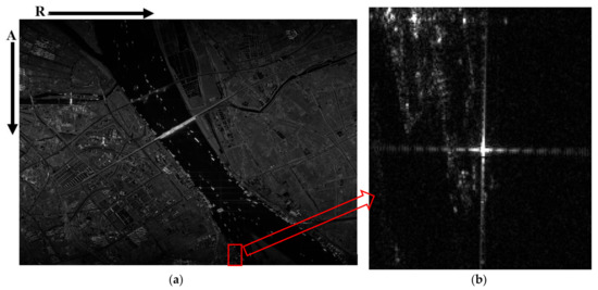 One primary image of GF-3 in ST mode. This image is processed by the two-step algorithm directly. (a) The whole image of one data take; (b) The local part of (a) which is a boat moored at the bank of the Yangtze River that we treat as a corner reflector.