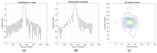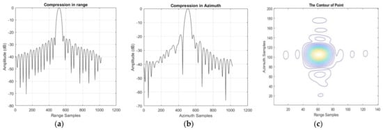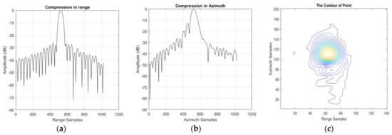 The contour in Figure 8c is not tidy enough, and this might be caused by the stop-and-go approximation in the DCSA. After stop-and-go correction, the result can be found in Table 7 and Figure 9. Obviously, the compression result in both slant range and azimuth was better compared with results in the last subsection. The sidelobes can be found in the contour shown in Figure 9c. However, the performance is still not good enough and the pulse seems a little noisy. The reason can be summarized as follows.
