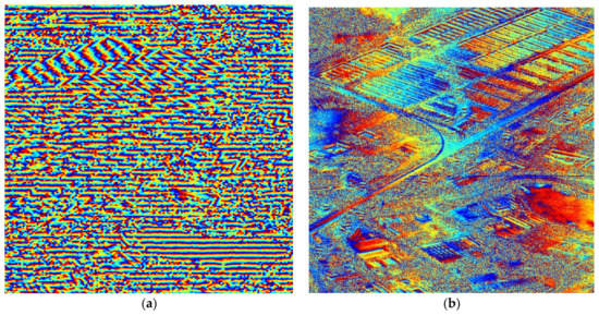 In order to verify the accuracy of the phase information, we conducted a repeat-pass SAR interferometry experiment based on the ST imagery above and a normal SL imagery on the same scene. The interferogram of the spot marked with white box in Figure 10 can be found in Figure 11a. Only when the data processing presented in this paper keeps the phase fidelity very well, can the ST focused image conjugate multiplied by the image obtained in regular SL mode effectively cancel the common backscatter to form an interferogram. More details of this interferogram experiment will be published in the future.