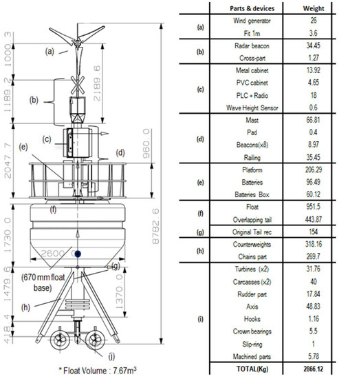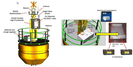 Figure 6 shows the location of most sensors and electronic devices, as well as the energy storage subsystem on the mast and platform buoy, respectively.