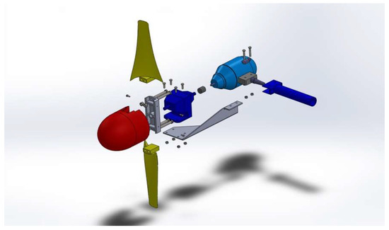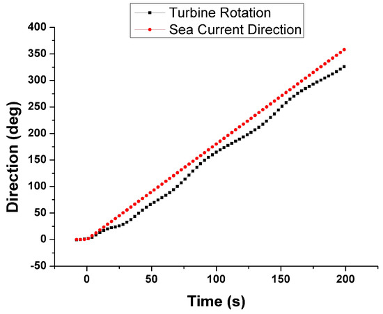 With this setup, the full buoy body and the inner rotating system for the turbines were successfully modeled. In Figure 2, we can see how the group of the two marine current turbines and the rudder follows the direction of the environment marine current (0.2 m/s) when varying it from 0° to 360°. No wind and no waves were simulated.