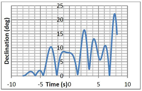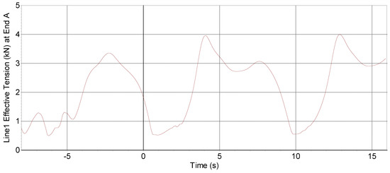 With these conditions, Figure 3 shows the declination of the buoy and Figure 4 shows the tension supported in one of the lines of the catenary system. This information served for the design in Orcina Orcaflex of the catenary system, as shown in Figure 5. In order to lighten the buoy’s total load, hybrid chains of the metal-polyester-nylon-metal type were used. Table 1 shows the composition length and weights of each of the sections. The stresses that support these chains are much greater than the maximum tension that would occur in adverse sea conditions. The study was carried out by simulation with Orcina Orcaflex software [29]. The use of intermediate floats of 0.5 m3 serves to create a virtual bottom at 30 m depth giving more stability to the buoy and lightening its load. The system of triple catenary joins a triangular metal piece whose arms surpass the turbines to avoid entanglement.