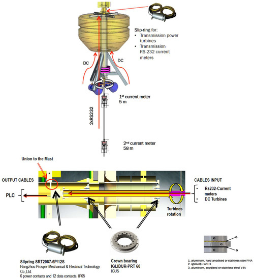 Consequently, current sensors will be used to evaluate the existing energy resources associated with marine currents. In our design, the buoy is equipped with two marine current meters located at two different depths, one is mounted near the surface, and the other one is close to the bottom, indicating current intensity and heading. The objective is to get information on surface currents versus bottom currents, which are usually colder and denser.
