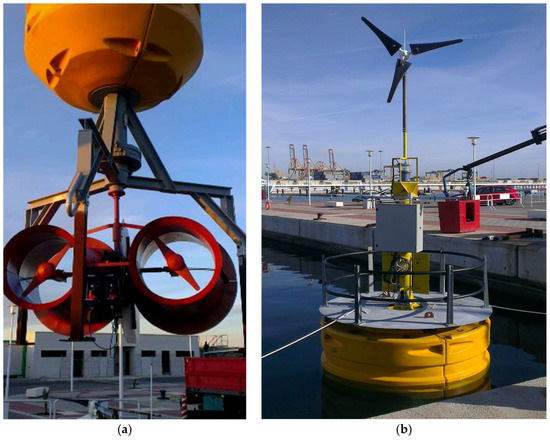 - Energy generation and storage subsystem, incorporating a Wind Turbine (WT) [34], two Marine Current Turbines (MCTs) [34] and a small photovoltaic panel in order to ensure a redundant source of power in situations of long periods of atmospheric calm. The energy storage subsystem is formed by an A00 RG VW-50-24 and two A00 RG S1B-24 from Ampair (Dorset, UK), and a Tristar 45 charge controller from Morningstar Corporation (Newtown, PA, USA), and two Absorbed Glass Mat type AGM batteries from VETUS (Schiedam, The Netherlands) [35].
