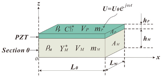 Section 0 and PZT in this structure play the main role and act as the excitation source; the motion equation is derived upon it and the corresponding parameters are depicted in Figure 2. Here, ρ, V, m, A, and h stand for the density, volume, weight, cross-sectional area, and thickness, respectively; the related subscripts “P” and “M” indicate that those parameters describe the PZT and the metal substrate (aluminum), respectively; and similarly hereinafter. A driving voltage U is applied on the electrode surface of the PZT, U0 is the amplitude of voltage, and E3 = U/hP. Lw stands for the width of the structure.