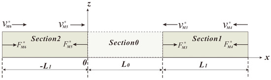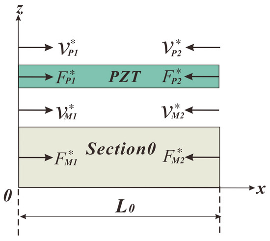 The distribution of forces and velocities in Section 0 and PZT is shown in Figure 3, where ν stands for velocity and F for force. The subscript “P” represents the PZT, and “M” the metal substrate; the other subscript “1” means that the corresponding parameter is located at the position of x = 0, and “2” means the same but at x = L0.