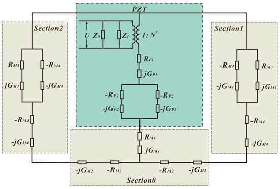 Equivalent circuits derive from the mathematical statement of the structure, namely, the motion equation. Although the calculation procedures of the equivalent circuit are developed in Mason’s edited book [32], the main parameters presented here are in complex numbers. For Section 0 and PZT of this piezoelectric structure, the motion equation is expressed in Equation (8). Since we focus on the longitudinal vibration, a displacement formula for an arbitrary point in Section 0 and PZT is assumed: