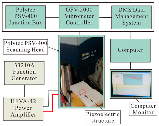 In order to verify the effectiveness of our equivalent circuit, a prototype of this piezoelectric structure was fabricated and tested using a Polytec PSV-400 laser vibrometer (PolyTec Inc., Waldbronn, Germany). The experimental setup is shown in Figure 8. The piezoelectric structure is supposed to work at free–free boundary conditions, so it was lightly fixed using expanded polystyrene boards to avoid restriction on its longitudinal vibration. The driving signal was generated by a function generator (33210A, Keysight Technologies, Inc., Santa Rosa, CA, USA) and amplified by a power amplifier (HFVA-42, Nanjing Foneng Technology Industry Co., Ltd., Nanjing, China). The vibrometer measurement system contained a Junction Box, Vibrometer Controller, Data Management System, Scanning Head, computer, and monitor, as shown in Figure 8.