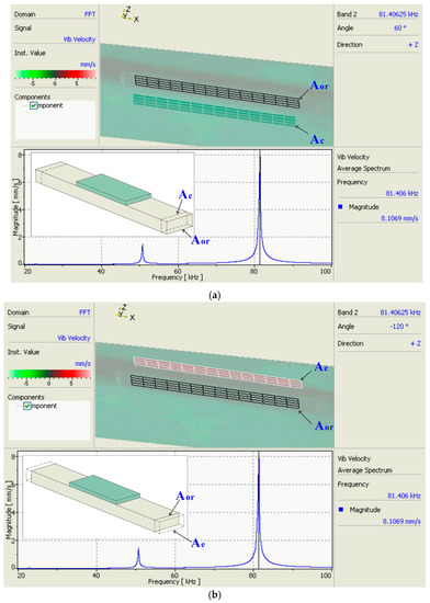 Figure 9 shows the vibrometer measurement results of this structure. The tested edge surface is perpendicular to the x-axis (Figure 1) and demonstrates longitudinal vibration at a frequency of 81.4 kHz. Aor stands for the original cross-sectional area, while Ac and Ae are the contraction and extension of the original cross-sectional area, respectively. This structure was also measured using an Agilent 4294A impedance analyzer (Keysight Technologies, Inc., Santa Rosa, CA, USA); the frequency tested by the impedance analyzer was 81.5 kHz, which is close to the vibrometer result of 81.4 kHz. An impedance curve was obtained and compared with the equivalent circuit result. The geometry and material parameters, including loss factors, are listed in Table 1 and Table 2. For the loss factor of aluminum , since the loss factor decreased with increasing frequency [33] and this structure was tested at high frequency (above 20 kHz), we assumed that it was equal to 1.0 10-3 [34,35]. The piezoelectric ceramic we used was Haiying P-51 (Haiying Enterprise Group Co., Ltd., Wuxi, Jiangsu, China), a PZT5 ceramic. Compared with PZT4, the loss factors in , , and of the P-51 are much higher; thus, the impact of losses can be clearly seen in the impedance curves in Figure 10.