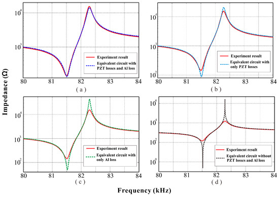 Figure 10a demonstrates that the impedance–frequency result of the equivalent circuit considering both the three PZT losses and the elastic loss of the metal substrate (aluminum loss or Al loss) has good agreement with the experimental result. It is notable that the deviations in Figure 10 are mostly the values of impedances ZfR and ZfA in resonance and antiresonance frequencies, respectively, while the frequency values simulated by the equivalent circuit have high accuracy and discrepancies in resonance and antiresonance frequencies are close to 0%. As for the values of impedances, for neglect of the aluminum loss (Figure 10b) or for neglect of the PZT losses (Figure 10c), the discrepancies in impedance values become higher compared with the experiment results. Moreover, the neglect of both the PZT losses and the aluminum loss leads to extremely high discrepancies (Figure 10d). The details are listed in Table 3. In summary, the consideration of losses (both PZT losses and Al loss) in the equivalent circuit increases its accuracy and thus makes it more effective in the study of piezoelectric structures.