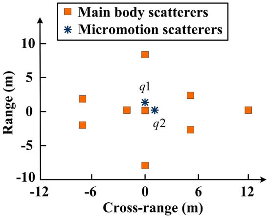 To demonstrate the joint sparsity of the main body signal in the time-frequency domain, we conducted the following simulation. The target model was composed of nine main body scatterers and two micromotion scatterers, as described in Figure 2. The micromotion scatterers and rotated around the origin counterclockwise with radii of 0.1 m and 0.2 m, and with rotating frequencies of 10 Hz and 3 Hz, respectively. The initial rotating phases were rad and 0 rad, respectively. The target moved along the cross-range direction with a velocity of 300 m/s. The radar carrier frequency was 10 GHz, the bandwidth was 600 MHz, the pulse repetition interval (PRI) was 1 ms, and the CPI was 1 s.